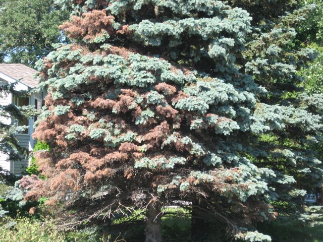 Colorado blue spruce (Picea pungens) is a popular landscape tree. It's attractive blue foliage and tolerance of urban conditions are big reasons it's been so heavily planted. Despite this, its true native range is the Rocky Mountains region. Thus, its life expectancy in the Anoka Sandplain is only around 30-40 years.